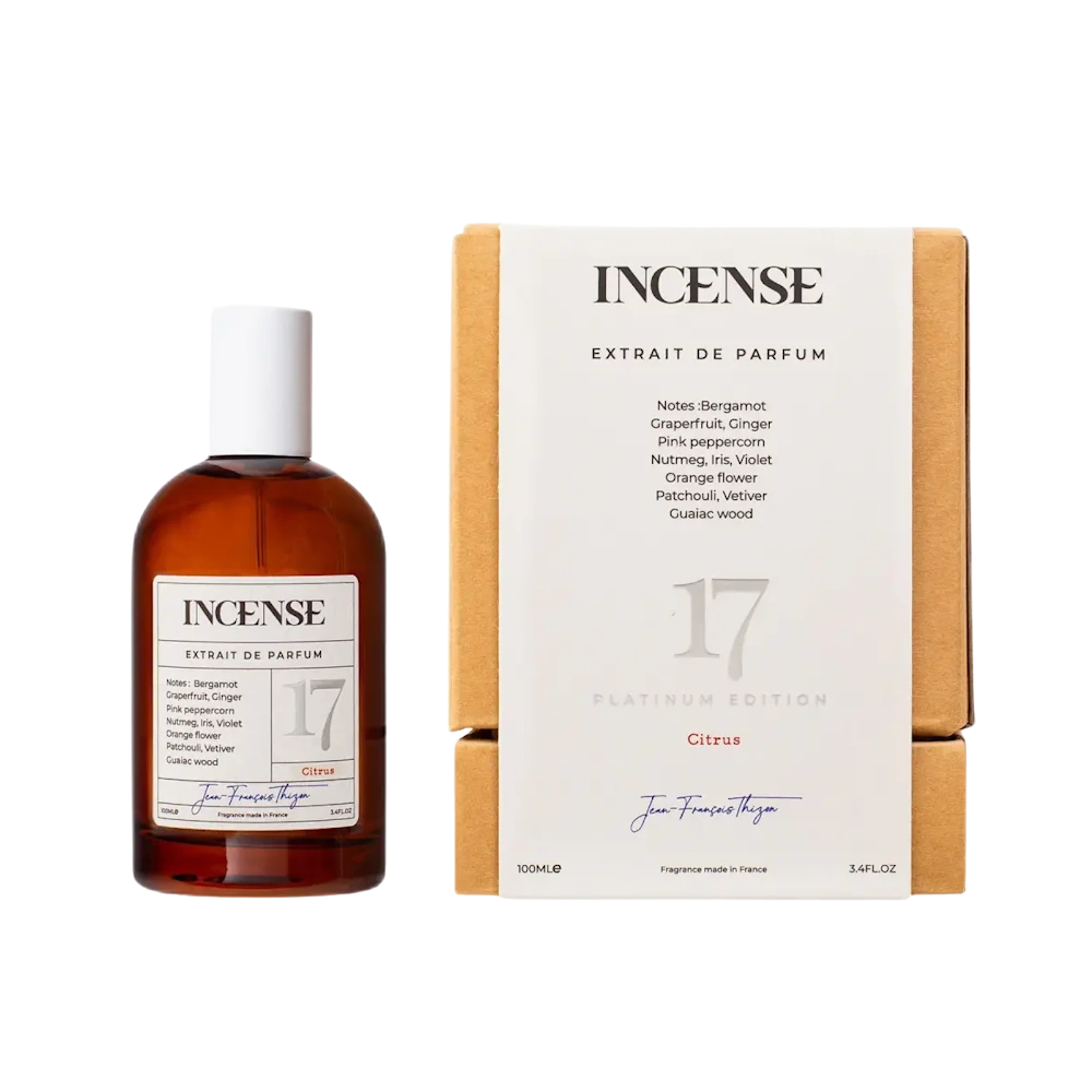 אינסנס 17 סיטרוס (פלטינום אדישן) הוא בושם רענן, יוקרתי ועוצמתי בצורת Extrait de Parfum בריכוז גבוה במיוחד, מה שמעניק נוכחות בולטת, עומק ועצמה בזמן שהניחוח נשאר קליל ורענן. הניחוח מאזן בין תחושת טריות הדרית חדה לבין עומק שרפי-אמברי מודרני ואסתטי.